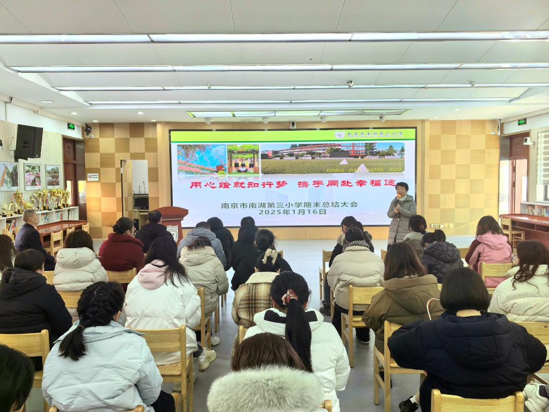 2025年1月16日,南京市南湖第三小学成功举办了期末总结大会,全体教职工齐聚一堂,总结本学期的教学成果,分析学情,部署未来工作,共同描绘学校发展的美好蓝图。首先,季涛花主任对语文学科的期末质量进行了全面分析。她结合不同年级的新题型,深入探讨了语文学科的教学现状,通过各年级的期末数据与错题情况,指出了学生在知识掌握上的薄弱环节,并用“精于工、匠于心、品于行”