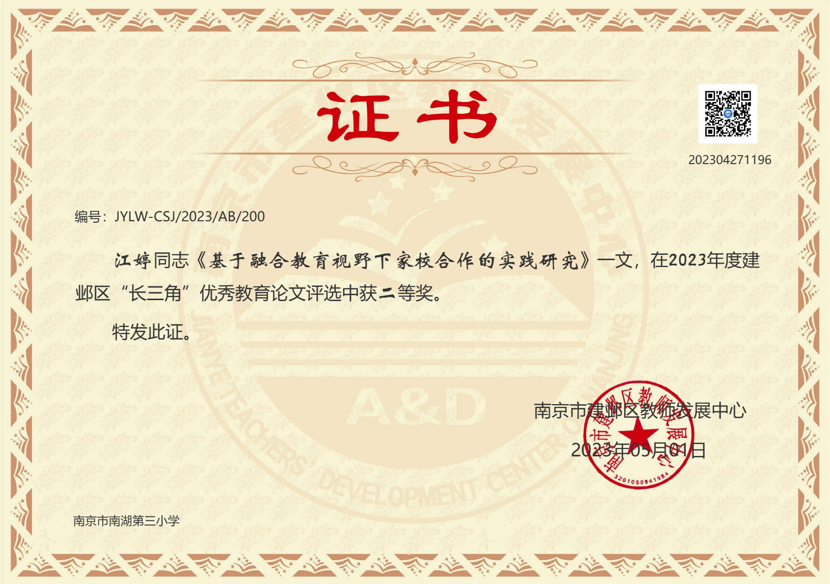 江婷老师《基于融合教育视野下家校合作的实践研究》一文,在2023年度建邺区“长三角”优秀教育论文评选中获“二等奖”。